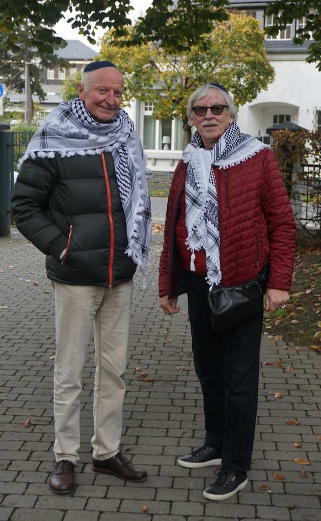 Zwei Neuwieder Bürger waren unterwegs in Sachen Frieden, mit Kippa und Kufiya. Nicht jeder verstand die Symbolik auf Anhieb. Man musste schon hinschauen. Einige haben sofort verstanden: das friedliche Miteinander von Juden und Palästinensern.