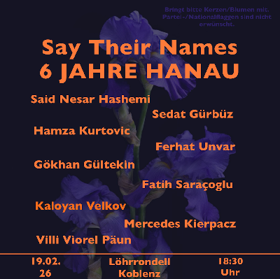 am 19.2.2026 wird an einer Gedenkveranstaltung in Koblenz an die Opfer des rassistisch motivierten Mordanschlags in Hanau erinnert. Könnt Ihr Euch vorstellen, trotz Ramadan zu dieser Veranstaltung zu kommen. Ich verspreche Euch als Christ und Autor dieser Worte, an diesem Tag mit Euch zu fasten und erst nach Sonnenuntergang etwas zu trinken und noch später erst zu essen.