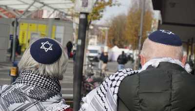 Die Kippa, die Kopfbedeckung jüdischer Männer, meist getragen an Orten des Gebets, war vereint mit der Kufiya, dem arabischen Tuch - beide sehr symbolträchtig und aktuell hochpolitisch.